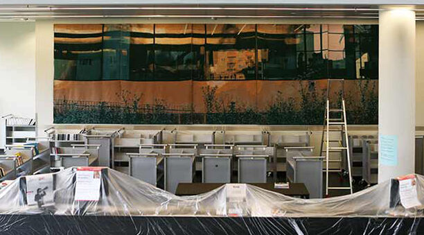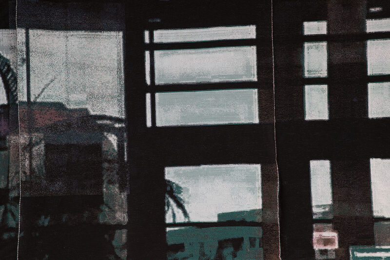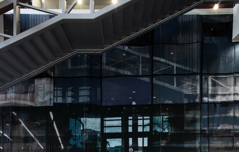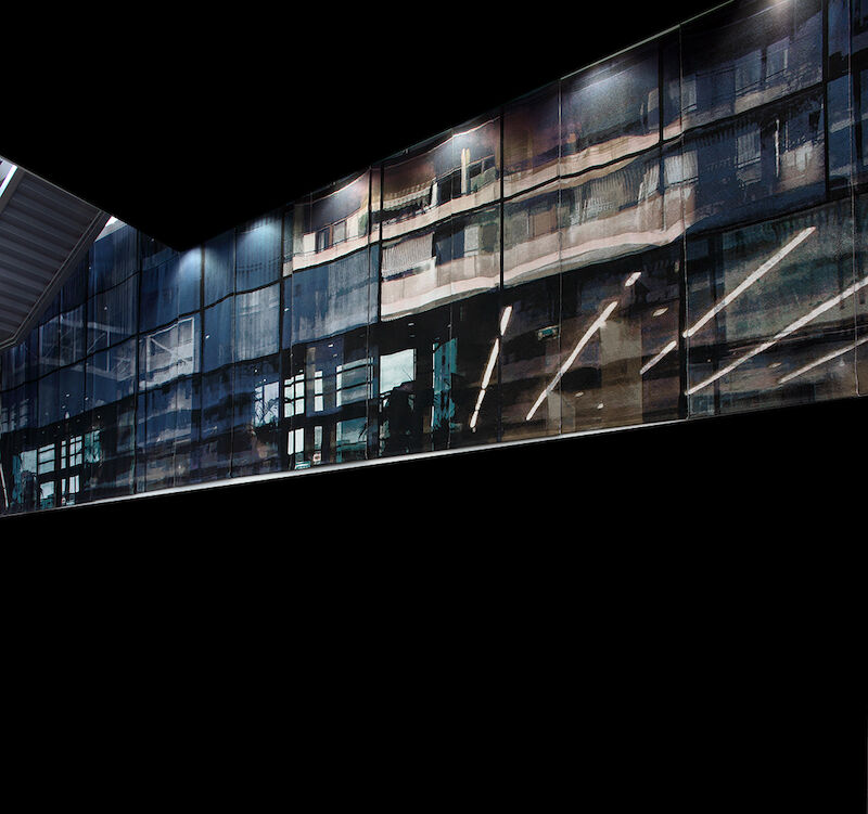 Motivik: Die Gobelins interpretieren Motive von Spiegelungen auf den Außenfassaden. Die lebendige Umgebung der Bibliothek wird zu einem Bestandteil ihres Innenraums.