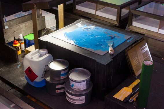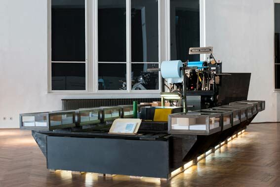Bernhard Cella installiert mit seinem Ausstellungsbeitrag eine am Verschwinden begriffene Produktionsumgebung – die Welt der Druckwerkstatt: Tisch, Regal, Papier, Druckplatten, Farbe, Arbeitskleidung,