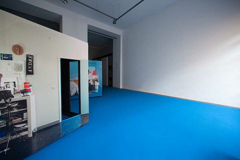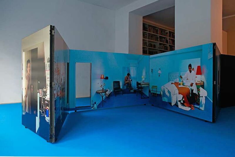 Im Zentrum der Ausstellung Schleusen steht ein Zimmer eines fingierten Hotels, das Bernhard Cella 2004 in einem Atelier der Cité des Arts[1] in Paris installierte: Hotel Ostblick. International Hotel without Rooms im „Herzen von Paris“. Schon der Titel verweist auf einen Charakter voller Widersprüche, die beim potentiellen Gast eine Kette an Gedanken weckt: ein Hotel ohne Zimmer; ein deutscher Hotelname für ein Etablissement im Herzen der Hauptstadt Frankreichs; oder etwa die Assoziationsmöglichkeit von Ostblick mit Ostblock. Dieses Zimmer des Hotel Ostblick errichtete Cella als Raum-im-Raum mithilfe von Holzrahmen, Teppichboden, Leinwänden, Zwischentür und Türrahmen, wenigen Gebrauchsgegenständen und Möbelstücken. Es schien dem weit gereisten Gast den gewohnten Komfort zu bieten – „mineral water throughout the day“ etwa oder „generously sized beds“ – und unterschied sich auf den ersten Blick kaum von einem „gewöhnlichen“ Hotelzimmer. Es konnte als Ein- oder als Zweibettzimmer bezogen werden – Fotos auf der Hotelwebseite beschrieben die Varianten. Lediglich die Farbe der Wände, ein eigener Blauton, der sich durch das Oeuvre Bernhard Cellas zieht, und der Charm einzelner Einrichtungsgegenstände unterschieden es von einem „gewöhnlichen“ Hotelzimmer.