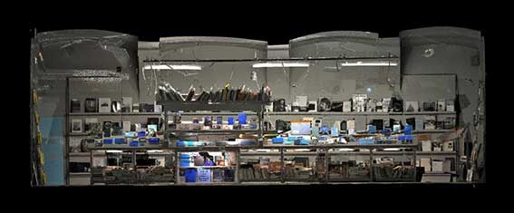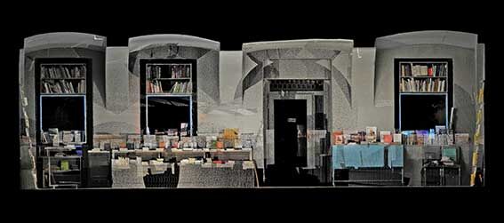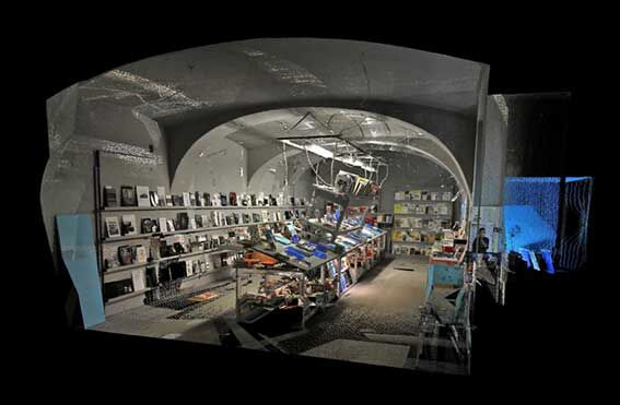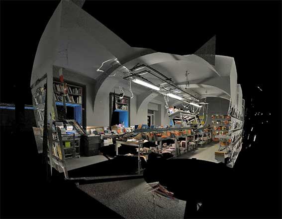 Bernhard Cella, Diskrete Teilmenge, Cross-Section 6, iris print on acid-free paper; 30 × 45 cm, Vienna, May 2010. Spacial coordinates and singular elements are captured as a digital scatterplot. It corresponds to the 1:1 model of a bookstore to be moulded in various materials. In mathematics, a ‘discrete topology given on a set defines all subsets as open sets.’
