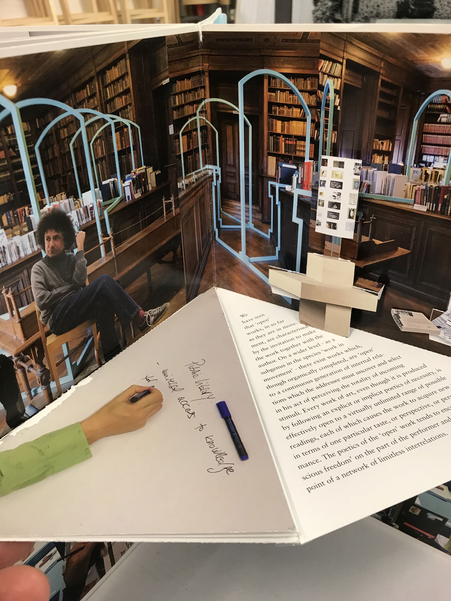 Die Publikation versammelt Fotografien, Diagramme und Setzungen, die Buchräume, Regalsysteme, Ausstellungsdisplays und Publikationskontexte in Beziehung setzen. Anstelle einer linearen Argumentation entfaltet sich eine räumliche Logik, in der das Umblättern selbst zur Bewegung durch einen gedachten Buchraum wird.